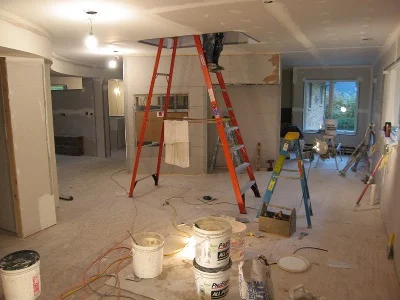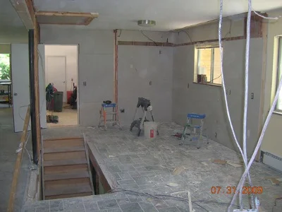 In the kitchen, the walls, appliances, and cabinets have been removed.