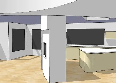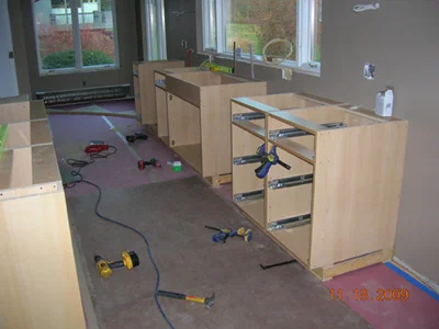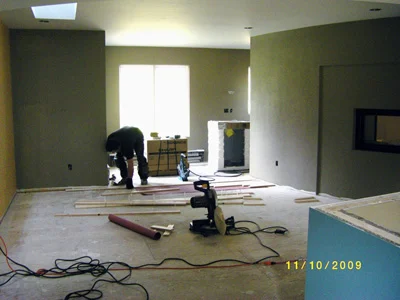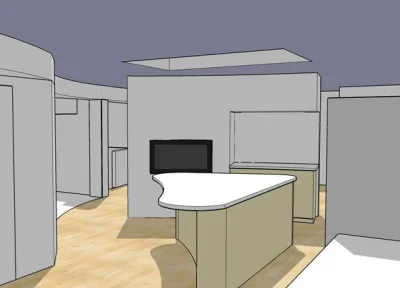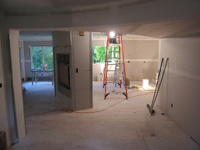 Here is a similar view of the kitchen and the living room, as it will be when finished.