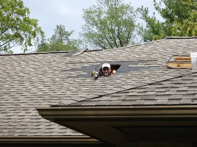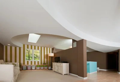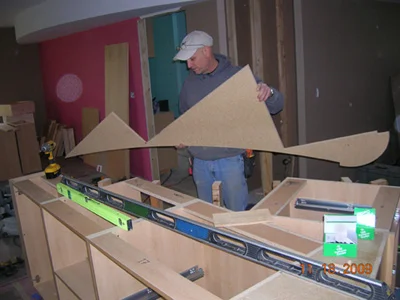 Here, Anne and Nick work to install the curved soffits in the family room.