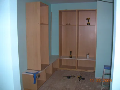 The mudroom with a drop zone, recycling storage, and coat cubbies.