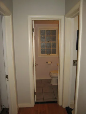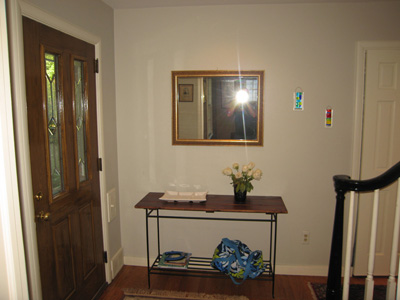 View from the hallway. The powder room and closet are on the left, the kitchen and dining to the right. Straight ahead is the new mudroom with the garage beyond.