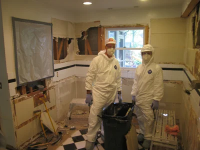 Demolition is well underway. Due to the presence of lead paint, we’re wearing respirators and plastic suits for our protection. All materials with lead will be removed, and the surfaces properly