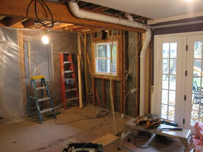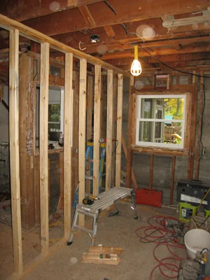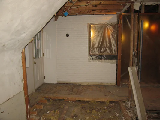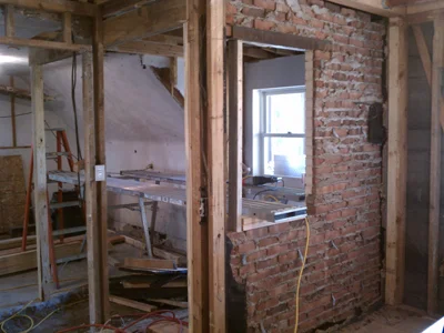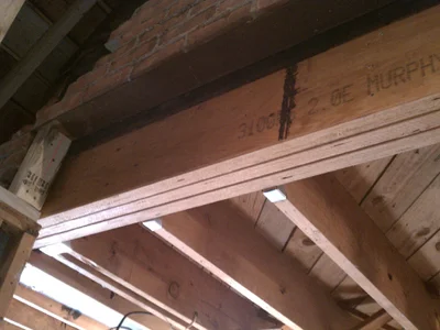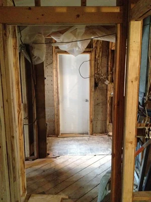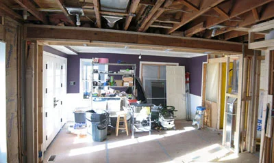 Looking the other way, you can see the large beam spanning the entire width of the dining room. Plumbing and ductwork have been routed along side it, and down at each end.