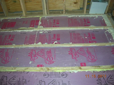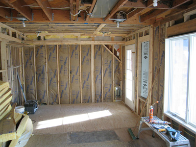 Looking into the kitchen. Plywood covers the insulation in the floor. We have installed fiberglass batt insulation in the walls and in the ceiling. Drywall will be coming next.