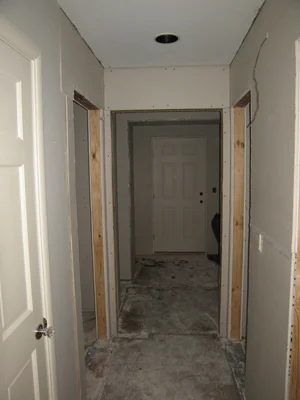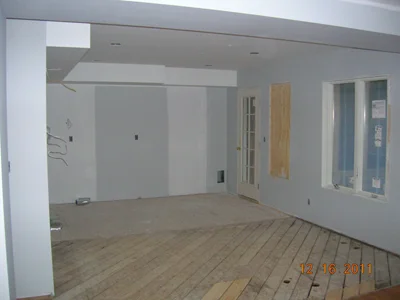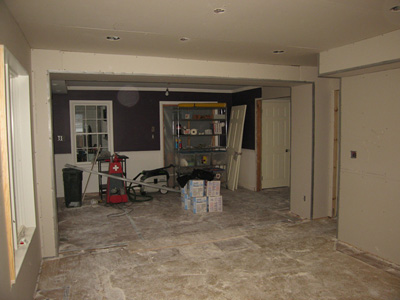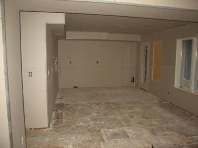 The drywall has been installed. This is the view from the dining to the kitchen.
