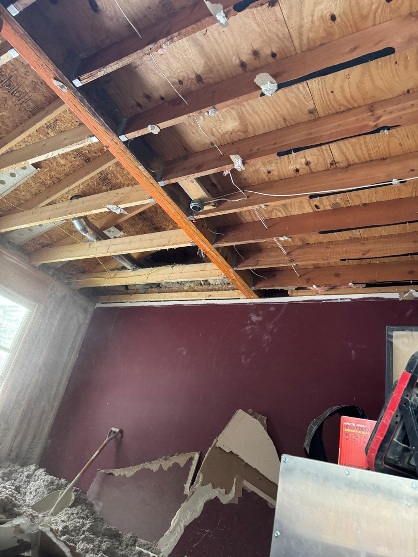 Its demolition week, and in the 1st floor dining room, the Rochman Design Build team is replacing the current ceiling joists into floor joists.