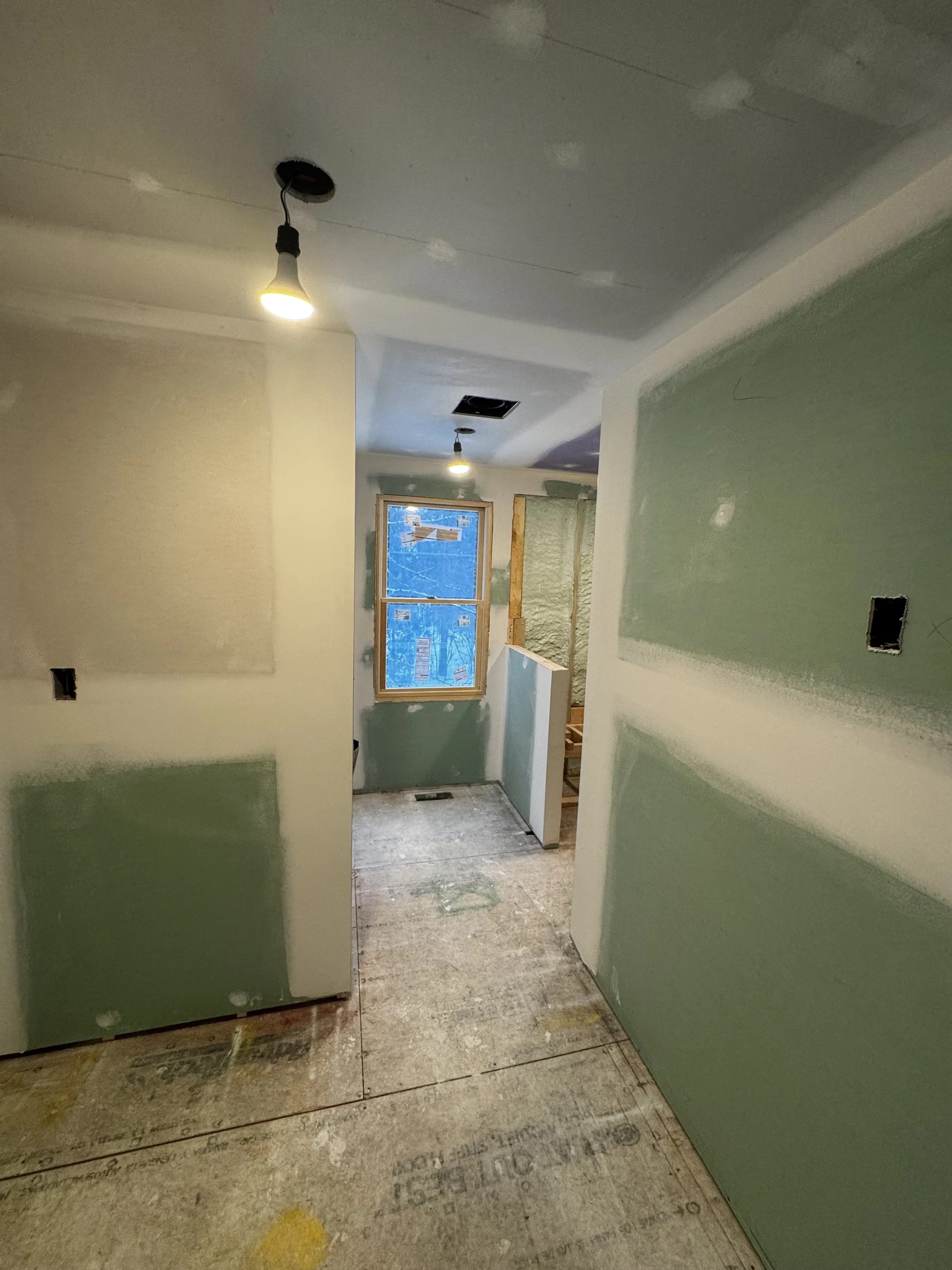 Watching the rooms take shape during this phase is always a highlight for our clients as they can now visualize their new space better. Our team has carefully installed moisture-resistant backing in the new shower (purple drywall) and vanity areas (green drywall). By closing the walls, we’ve moved from a complex network of "bones" to a clean, primed canvas where the natural light from the new window placements can truly begin to illuminate the space.