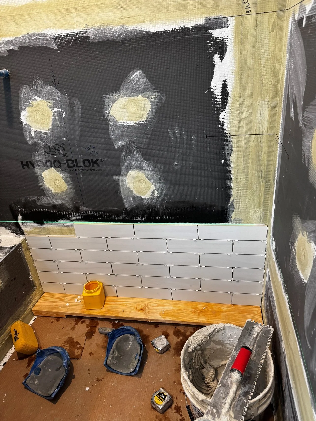 In the Primary bathroom, wall tile has begun with 3x12 subway tile on all of the walls, and a solid surface benchtop to come.
