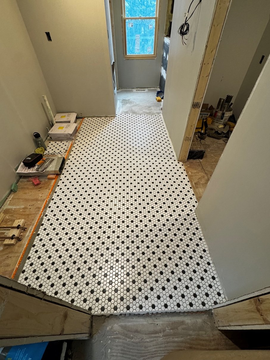 Comfort and precision are the primary themes of our recent work. In the primary bath, we have successfully installed a beautiful penny tile floor, which sits atop a newly integrated heating system designed for maximum comfort. The walls are beginning their transformation with classic 3x12 subway tile, which will eventually be complemented by a sleek, solid-surface benchtop. Simultaneously, the kids' bathroom is progressing quickly; the bathtub is fully prepped and waterproofed, and the first coat of paint has been applied to the walls, providing a glimpse of the final color palette. These layers of detail—from the close-up texture of the penny tile to the specialized waterproofing—ensure that these spaces are as durable as they are beautiful.