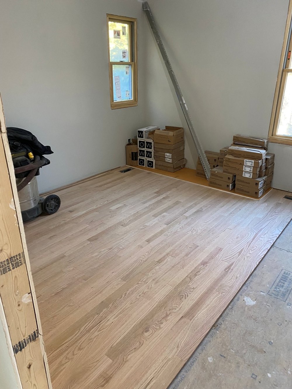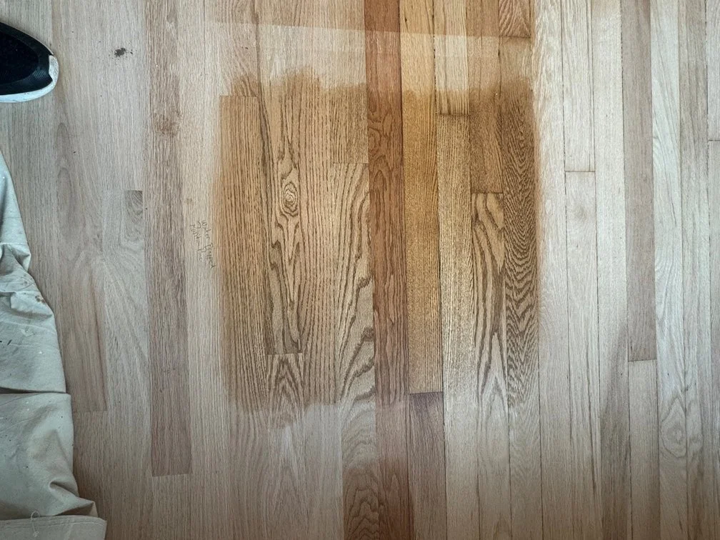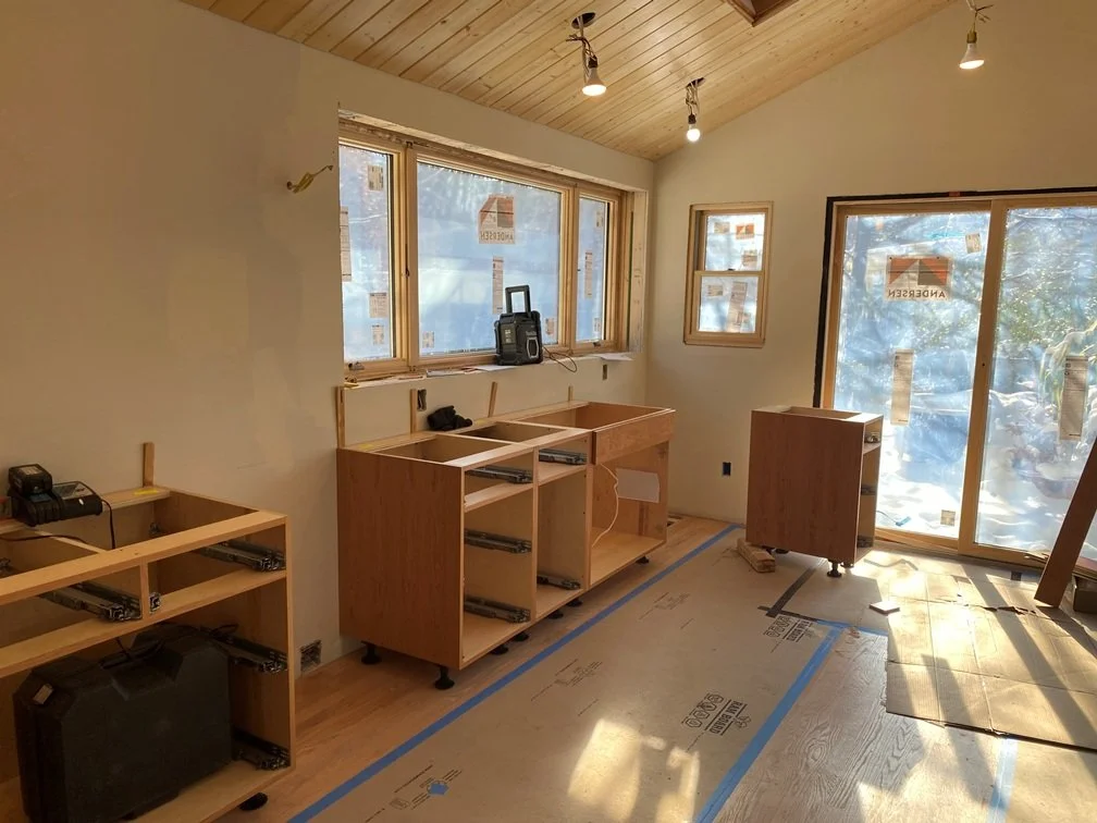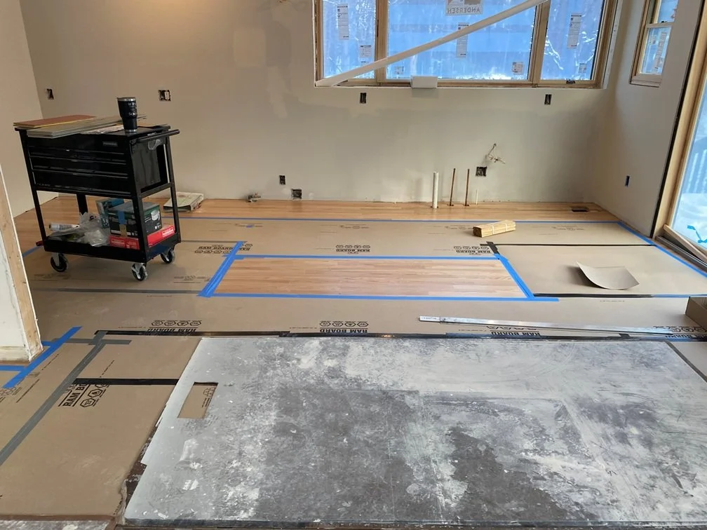 Now that the floors are stained throughout, the Rochman Design Build team is ready to lay out floor protection and outline for the kitchen cabinetry.