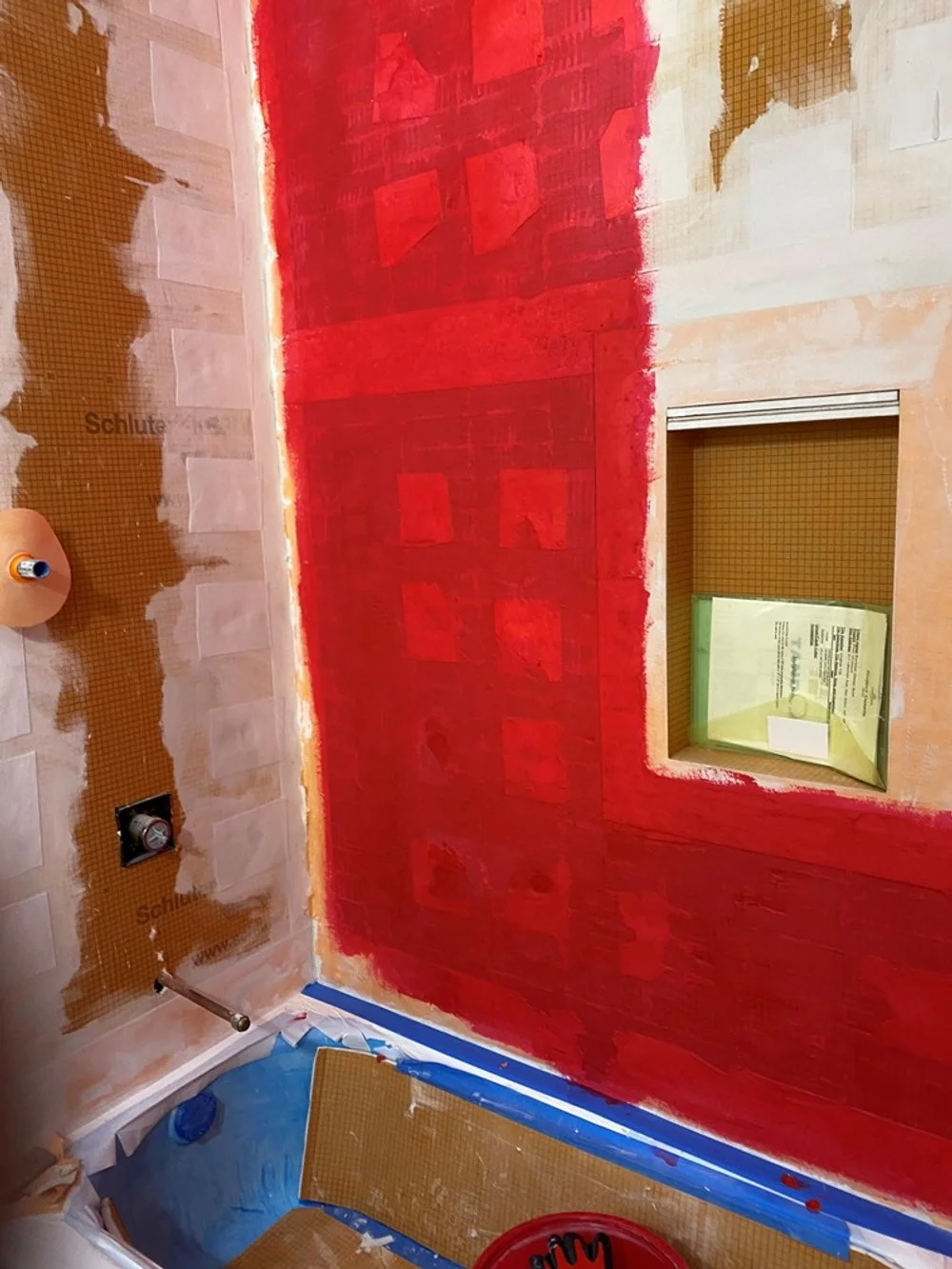And the 1st floor bathroom is being waterproofed and prepped for tiling.