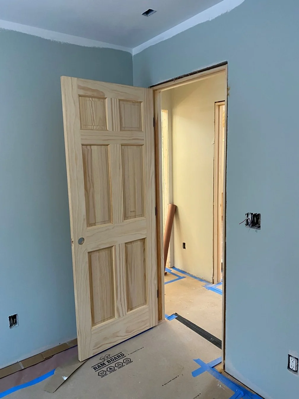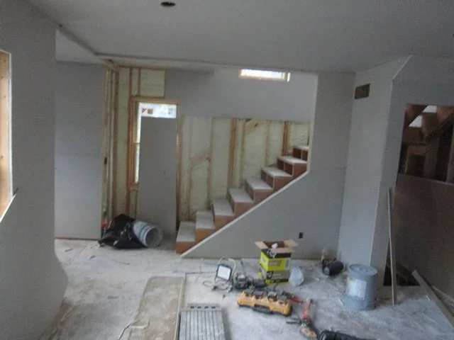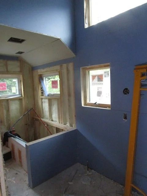 Drywall is getting installed throughout the house, Including the future “wet room” (see below).