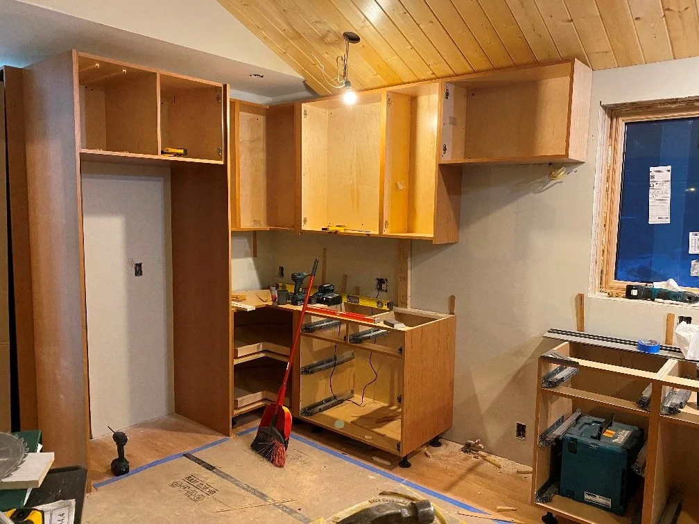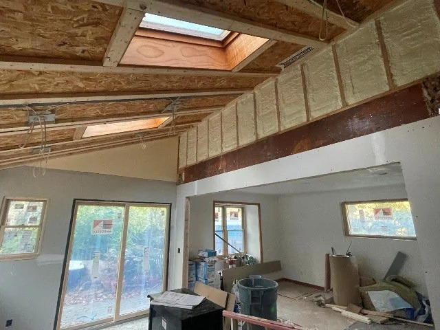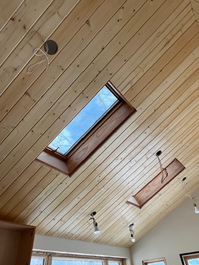 The V groove pine ceiling is being prepped for the new ceiling and all the drywall is hung throughout the house.
