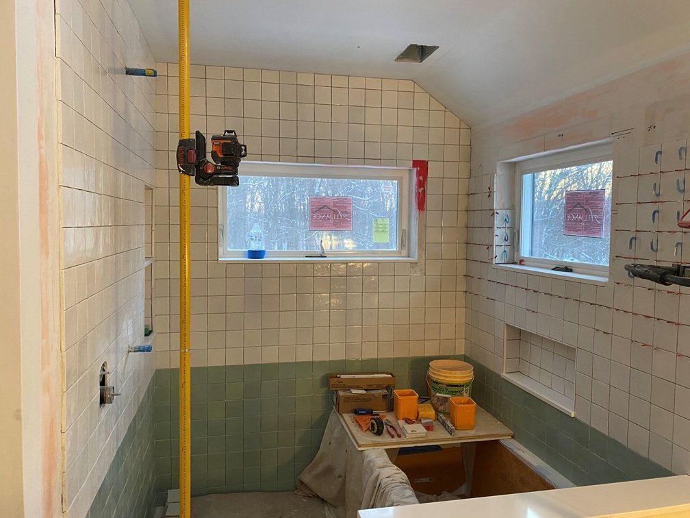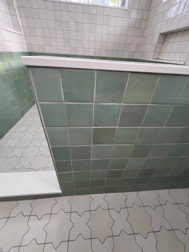 While on the 2nd floor, the shower tiles of the primary bathroom are being grouted.