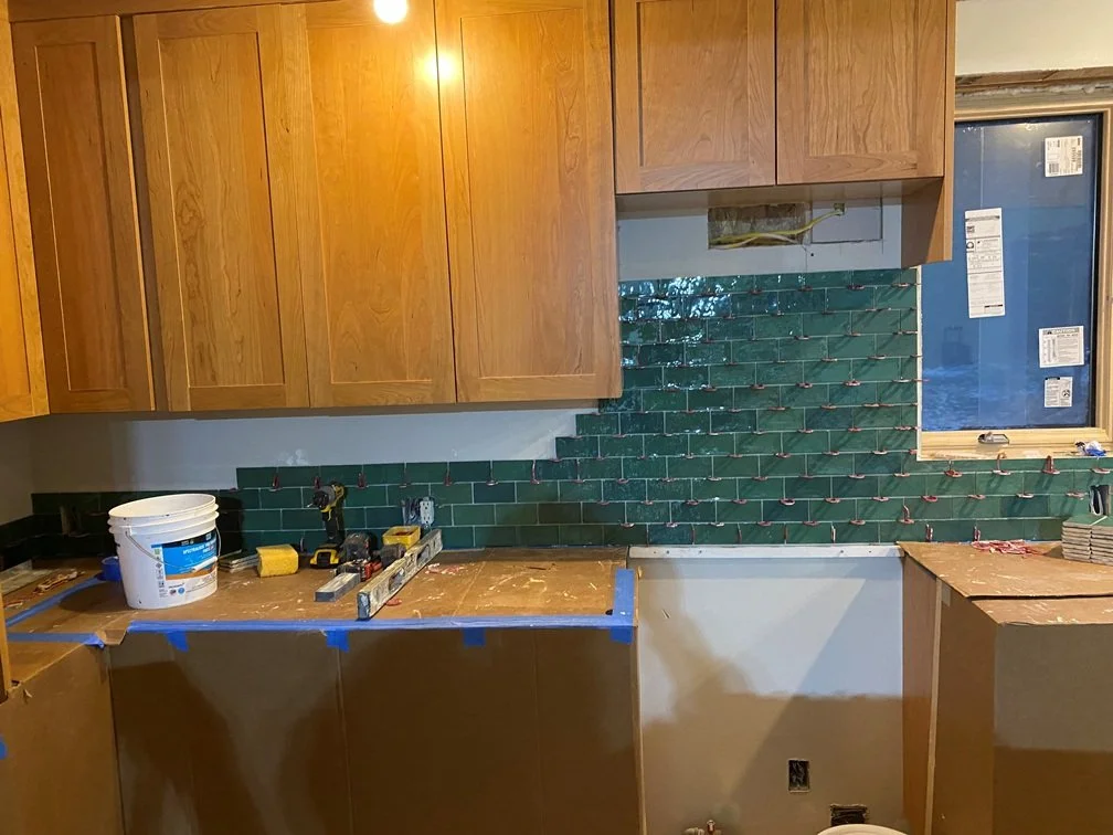 This gorgeous green tile for the kitchen backsplash is called Fez Emerald 2×5 Field Tile Glossy; so rich.