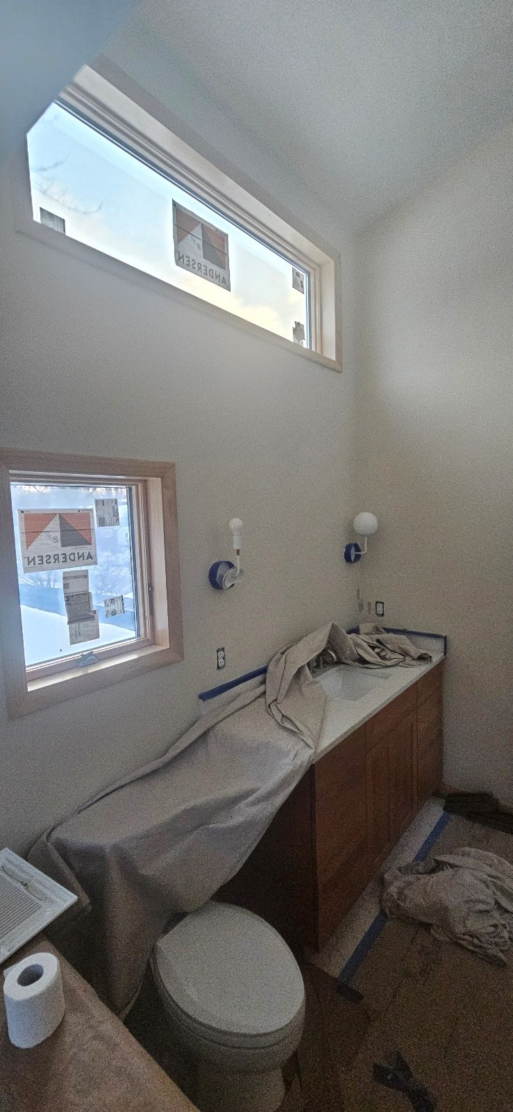 We are highlighting the natural beauty of the home’s structure with clear-coat interior wood finishing. This clear finish enhances the warm tones of the vaulted tongue-and-groove wood ceilings and the matching wood trim around the Andersen windows and interior doors. And, the addition is truly coming to life as the final interior paint colors are applied. Soft, cool-toned neutrals on the walls create a modern, airy feel that balances the warmth of the natural wood trim and maximizes the light from the new windows.