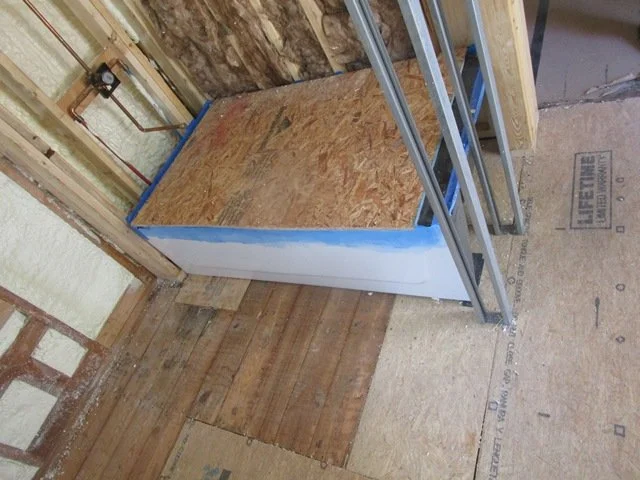 In the 1st floor bath, a new bathtub is being protected and prepped for drywall installation.