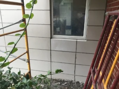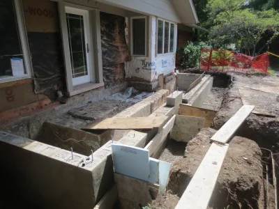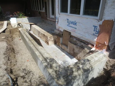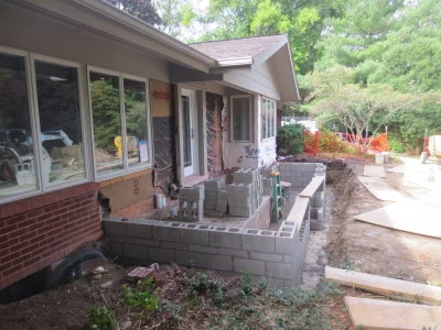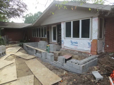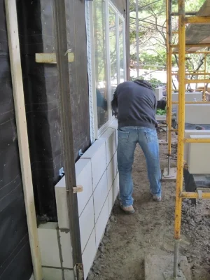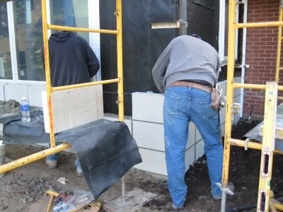 The concrete block steps back to create a brick ledge for the new masonry cladding.