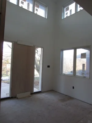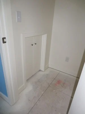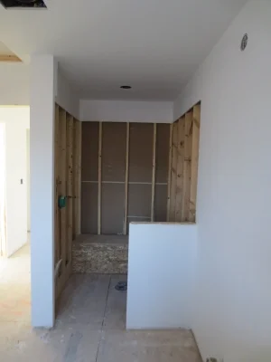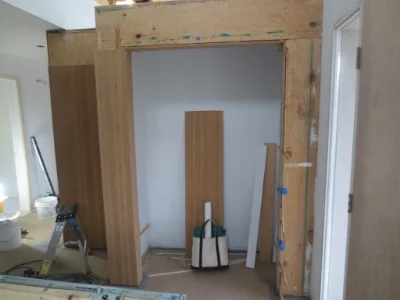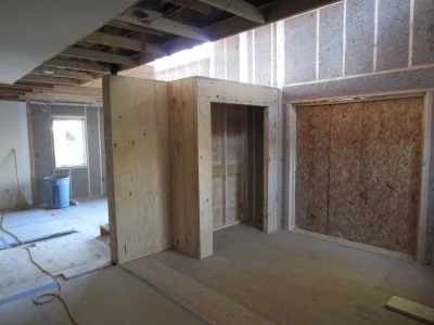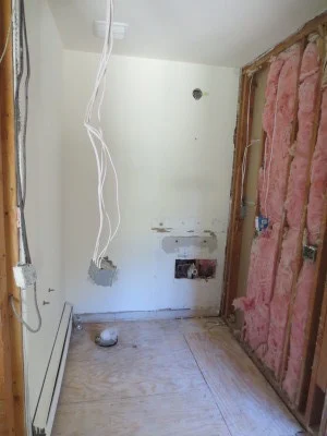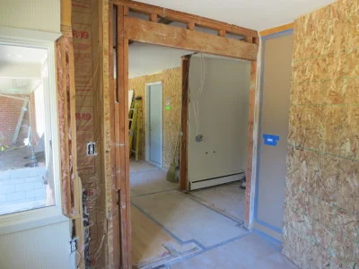 This is the new front entry, with the insulation all cleaned up. The closet walls will get