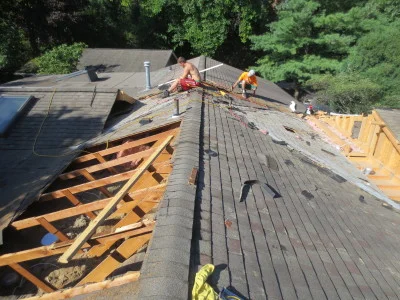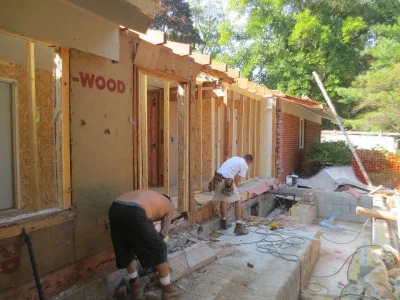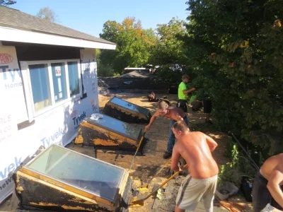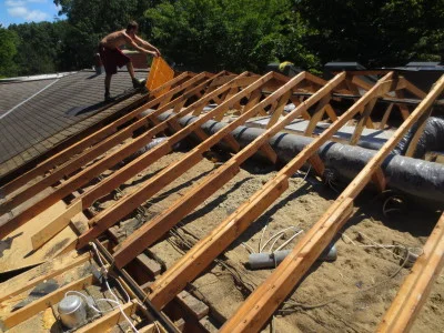 The roof is being peeled back carefully, to expose the heating and cooling ductwork and the electrical.