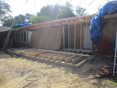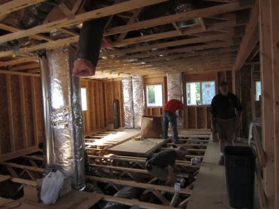 Floor framing is going down. If you noticed, one of the joists is an orangey color.