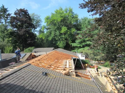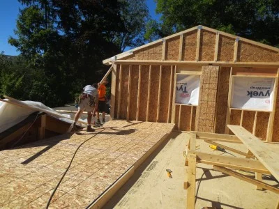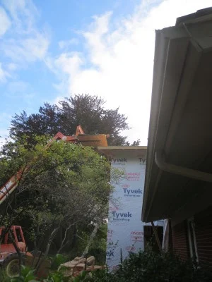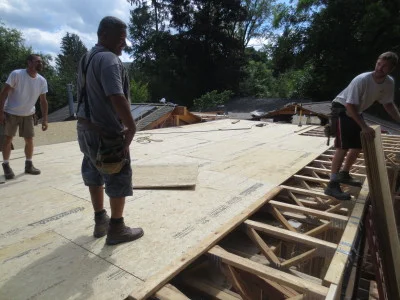 Plywood roof sheathing is lifted to the top, and the crew gets us ready for shingles.