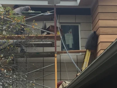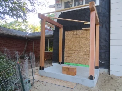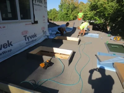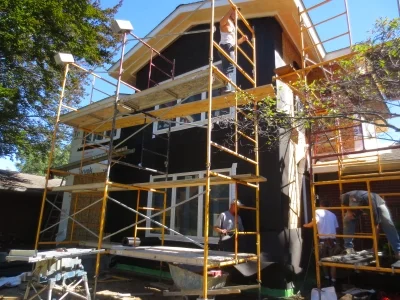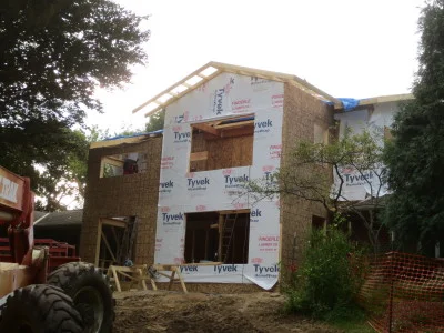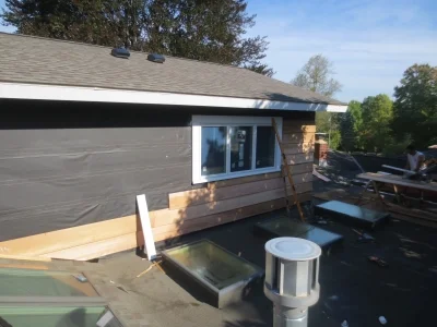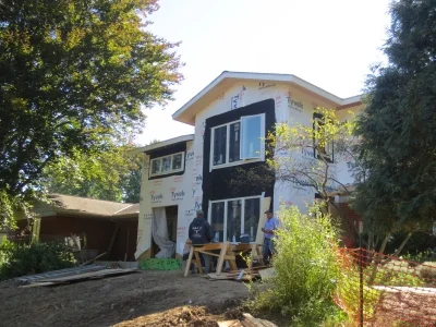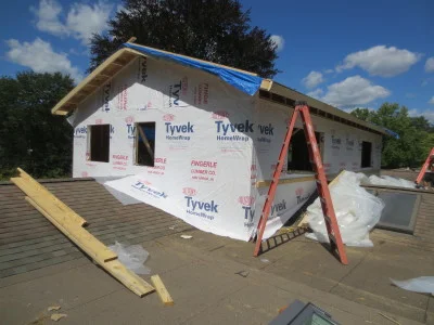 In no time, they are finished up here. The Tyvek housewrap is a one-way vapor barrier.