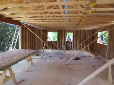 Floor trusses are all in, and the plywood sub-floor is almost done.