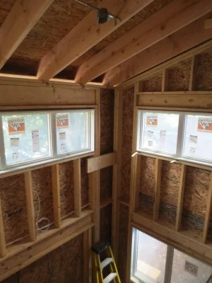Scaffolding gets the insulation installers to the top of the cathedral ceiling.
