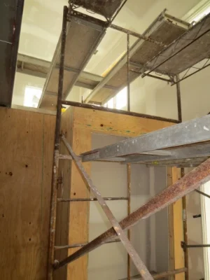 Scaffolding gets the drywall and plaster contractor up to the tall ceiling spaces.