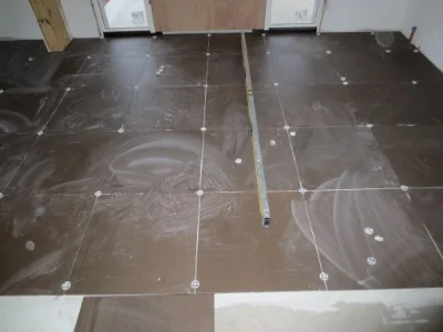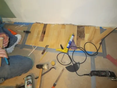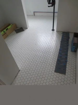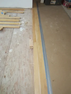 Here, the transition between the existing hardwood and the new tile floors is set.