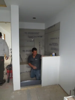 The shower pan is created, and tested per code, to make sure it holds water without leaks.
