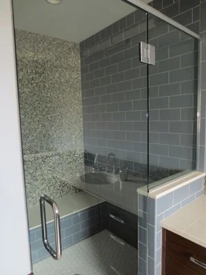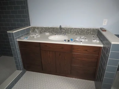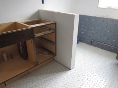 Cabinet hardware for doors and drawers are ready to be installed. There will be a framed mirror over the vanity and a glass door at the shower, then this space will be finished.