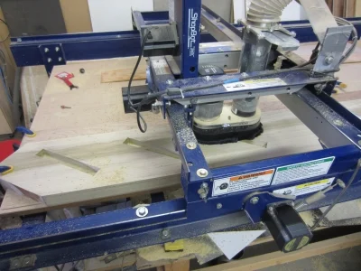 The CNC machine seen here (Computer Numerical Control-a computer that controls tools with precision) is used to mortise the stringer to receive the tenon on the tread.