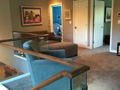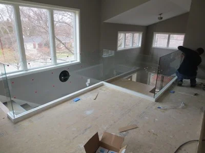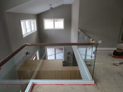 A main feature of this project will be the stairs, which will wrap around the breakfast nook and float to the second floor. It will be surrounded by glass railings with wood caps.