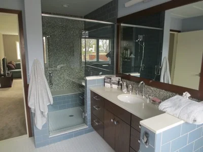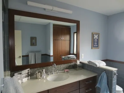 The bathroom has walnut cabinets with a matching mirror frame, window and door trim and tile cap.