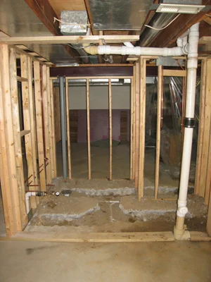 The interior wall framing is going up, including here at the bathroom.