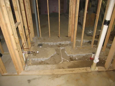 The concrete floor has been opened up, allowing us to install the plumbing for the new bathroom.