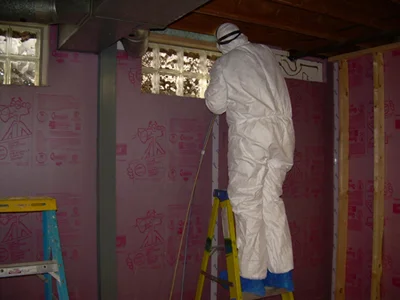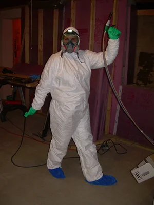 Here is Anne, preparing to spray foam insulation at the rim joists. She is wearing the appropriate protective gear: a tyvek suit, goggles, gloves and a respirator.