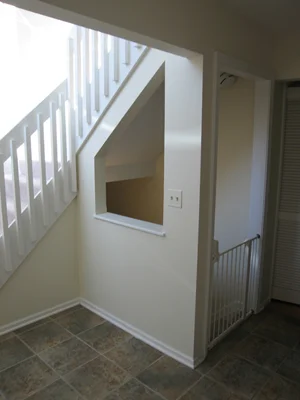 Doors are also hung. The shorter door on the right is cut down to fit under the staircase.