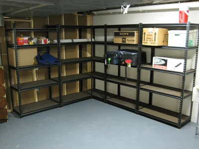 Brand new storage racks in the mechanical room, over a freshly painted concrete floor.