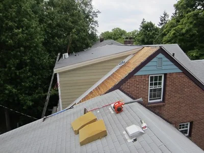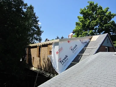 A rubber membrane roof is installed on the low-sloped dormer of this bed and bath addition. New asphalt shingles are about to be laid and flashed to the new dormer wall at the side portions of roof.