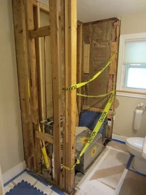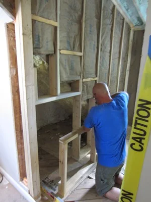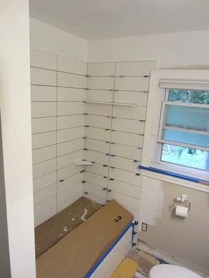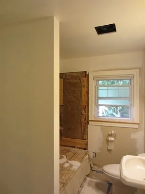 We leave off the drywall behind the tub. This area will get a different material, called Durock.