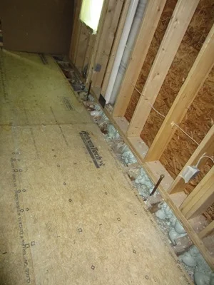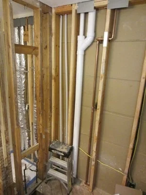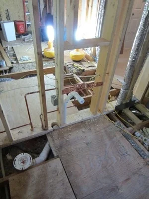 Rough drains and supplies at the new second floor bathroom is plumbed.