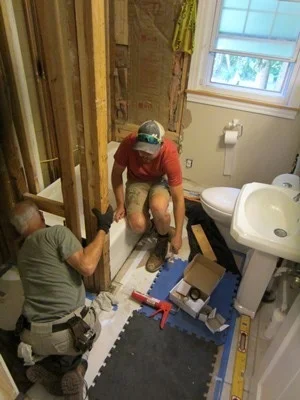 Now that the drain lines are in from the bathroom above, we can install the new tub at the first floor.
