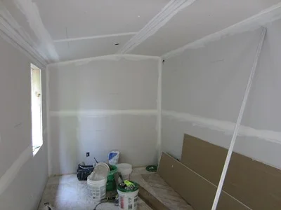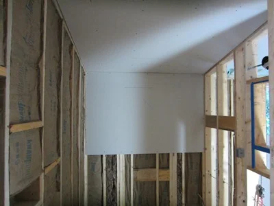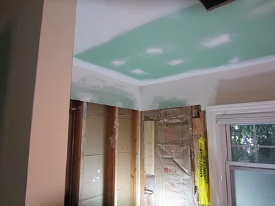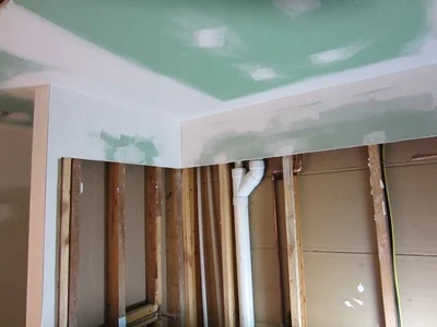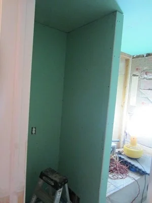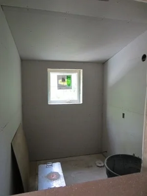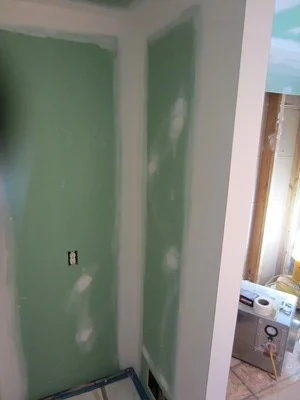 It’s time for drywall. A moisture resistant drywall is installed at the bathrooms.