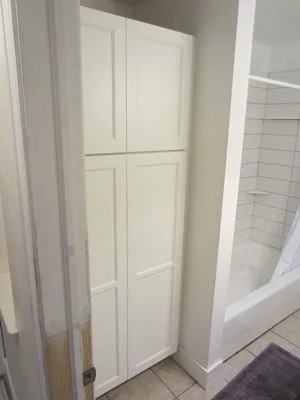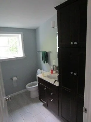 A second bathroom gets a light remodel, with new tile and plumbing fixtures at the tub.