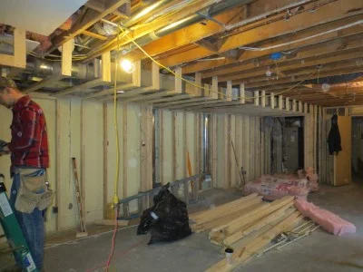 In the basement, before drywall has gone up.
