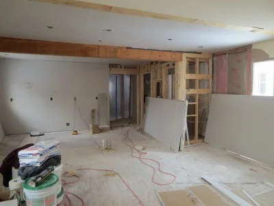 Upstairs, the drywall is already being hung.