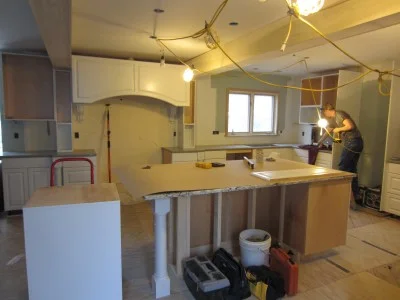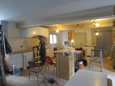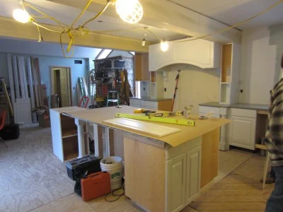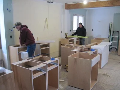 Cabinets are being installed in the kitchen.